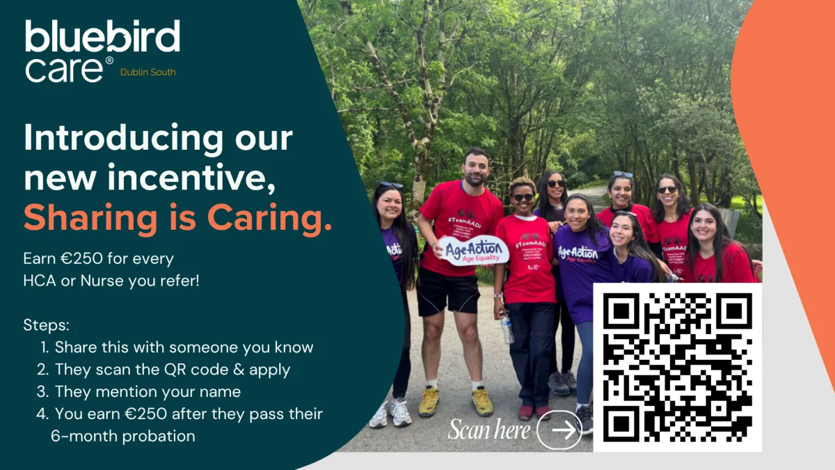 Already part of the Bluebird Care family? When you refer a friend to join our team, you can earn €250 once they pass their 6-month probation.